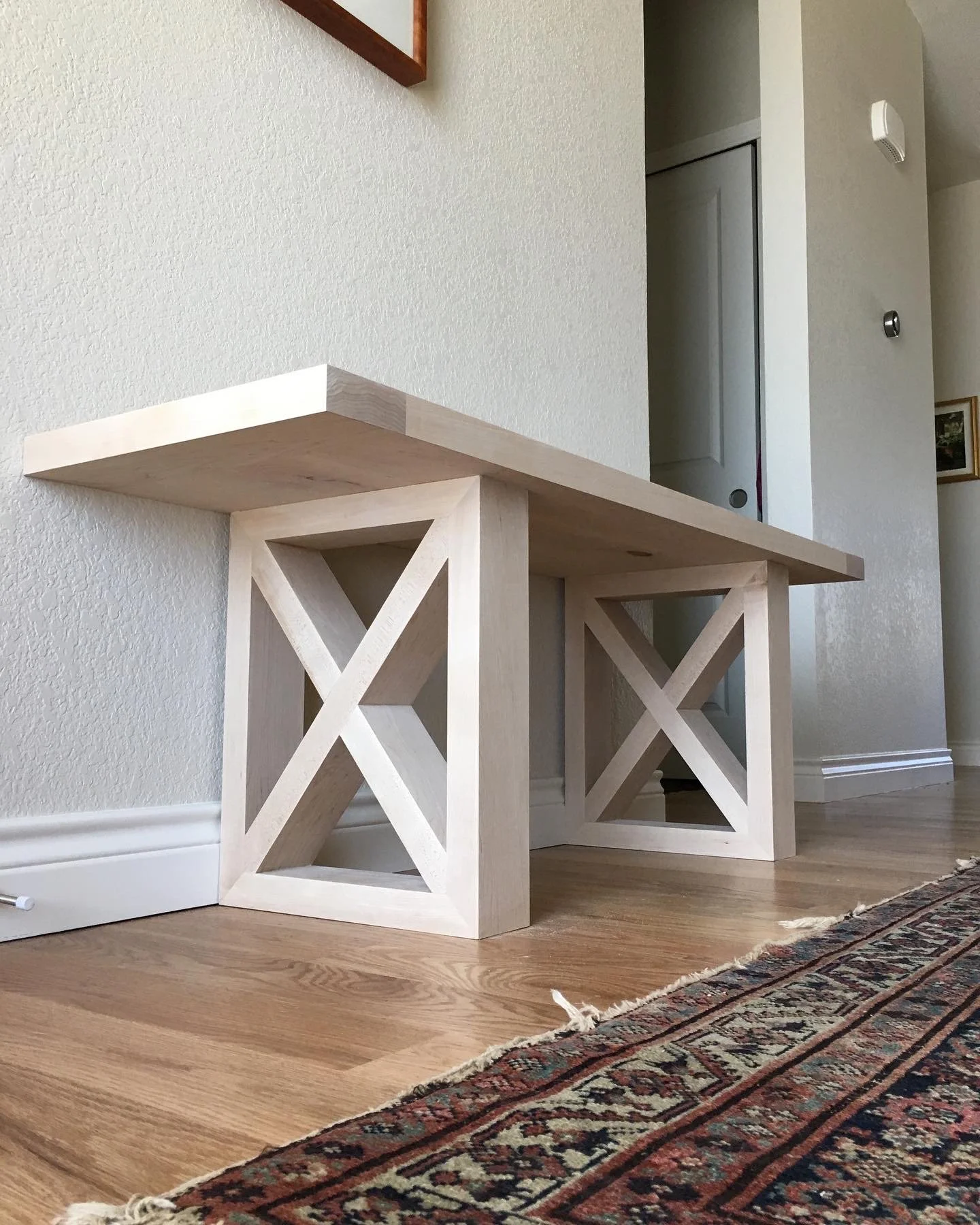 Custom Scandinavian Entry Bench made from maple with breadboard top, featuring floating tenons and bridle joints for precise, durable joinery.